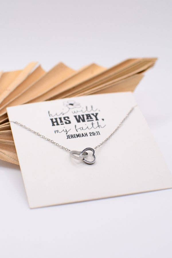 Celebrate faith and love with this Double Heart Necklace, a dainty design featuring two interlinked hearts that symbolize unity, trust, and God’s plan. Inspired by Jeremiah 29:11, this piece makes a meaningful gift for women of faith—perfect for baptisms, birthdays, encouragement, or everyday wear. Details: - Design: Two delicately linked hearts in a timeless silhouette - Card Message: “His Will, His Way, My Faith” with Jeremiah 29:11 Scripture - Materials: Stainless steel in silver or gold-plated finish - Size: 17.5" chain with 2" extender for an adjustable fit