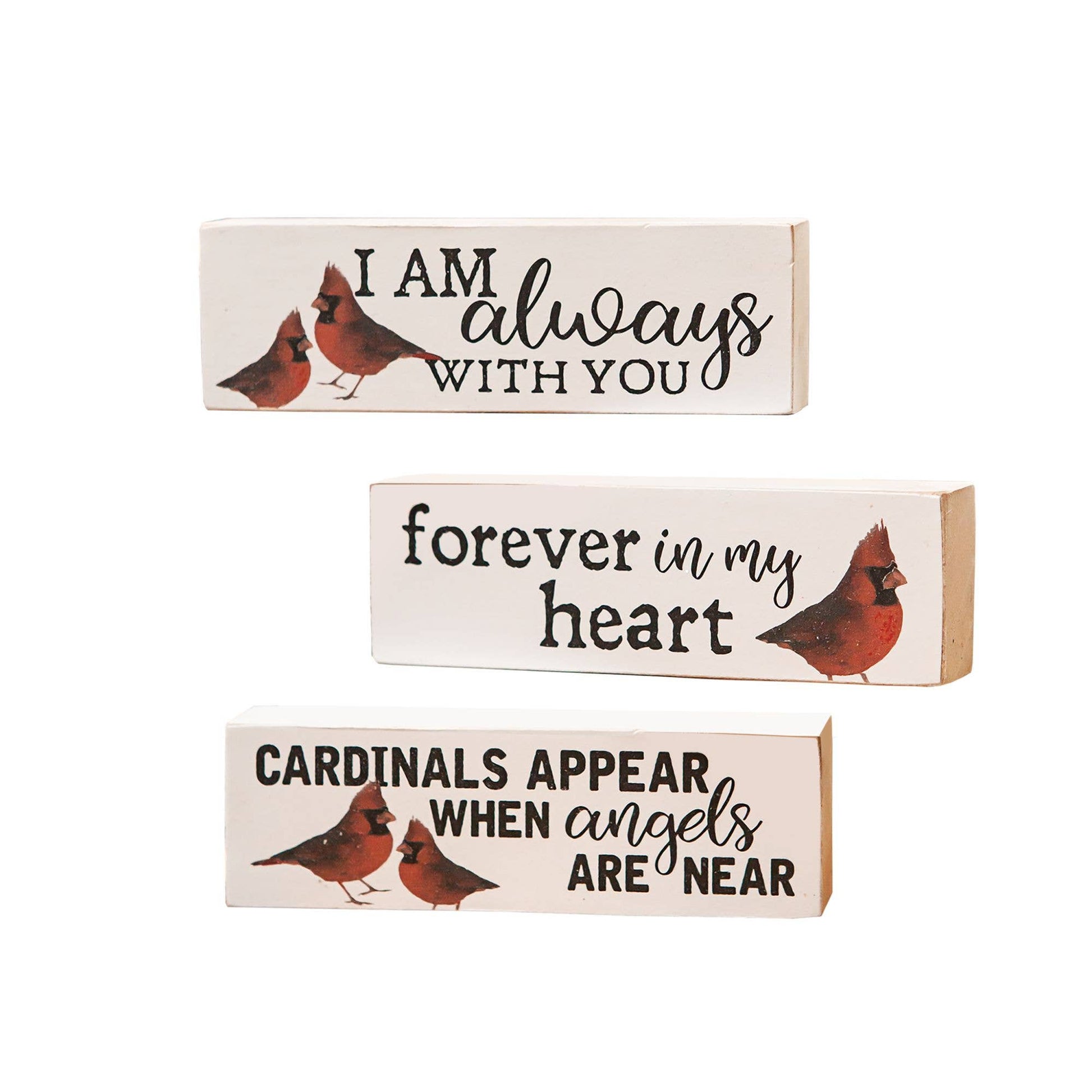 Set of three wooden Always With You Cardinal Blocks feature three different prints of cardinals and lightly distressed lettering on a clean white background with painted edges. Phrases include “I am always with you”, “forever in my heart”, and “Cardinals appear when angels are near”. Blocks each measure 1.25" H x 4" W x .75" D.