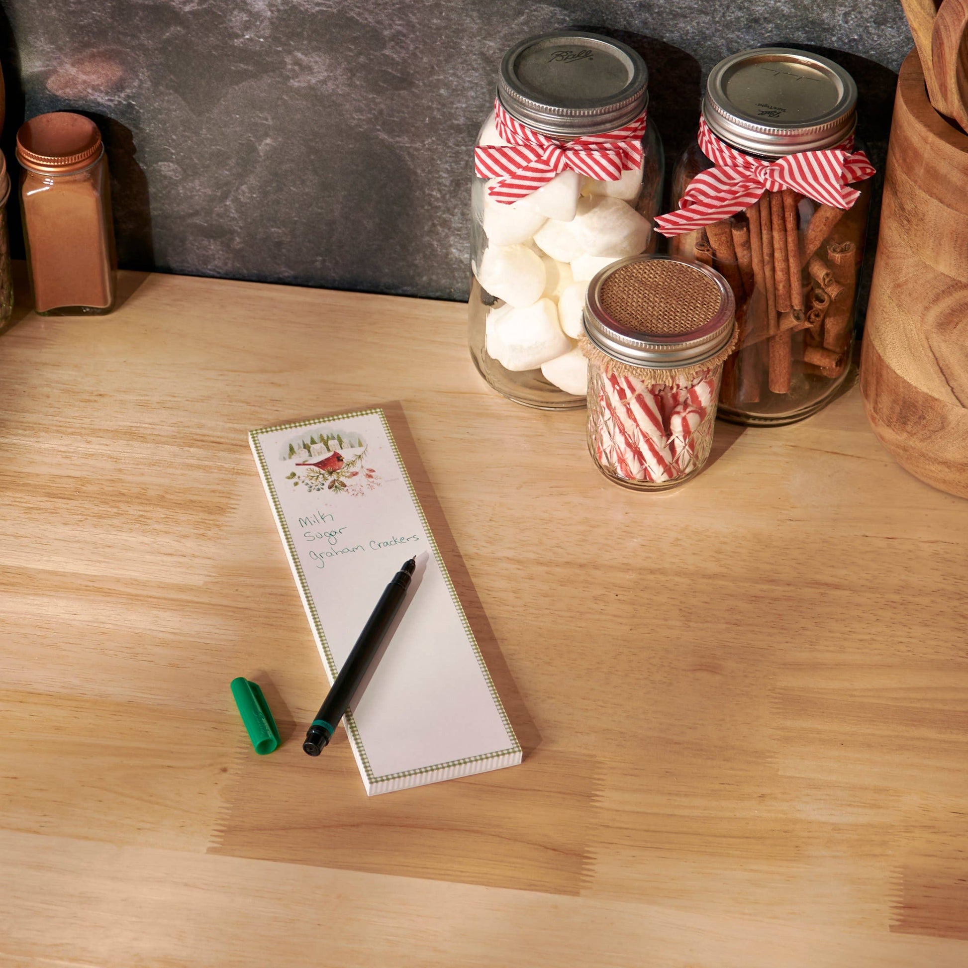 A list notepad from our Christmas Collection displaying a comforting scene of a cardinal on a winter branch. List pad also features blank space underneath design for writing and a coordinating green gingham pattern along the border. Designs are replicated from original artwork hand painted in a delicate watercolor style. Seasonal list pad includes 60 pages and a strong magnet to easily hang on magnetic surface for display. Our Winter Cardinal list pad is proudly made in the USA. A charming seasonal accessory perfect for adding functional style to any space.